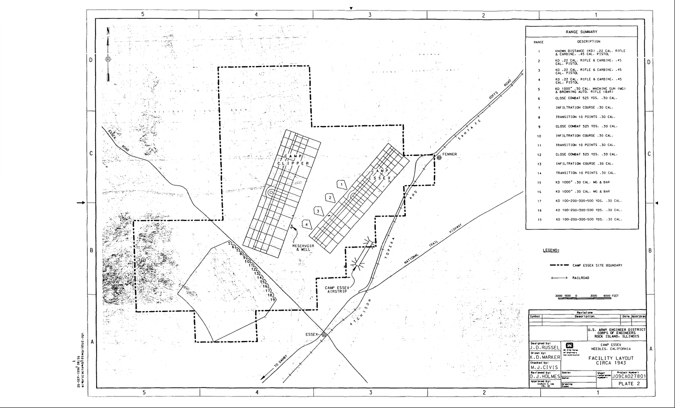 LOCATION: The Camp Essex site is located in an undeveloped region of San Bernardino County, California, approximately 32 miles west of Needles, California. Camp Essex is located within T8N, R16E, Sections 1-3, 10-30, 33, 34 (San Bernardino Meridian); T8N, R17E, Section 3-9, 17-19; T9N, R16E, Sections 22-27, 34-36; and T9N, R17E, Sections 31, 32 and 33. [Army Corps of Engineers]