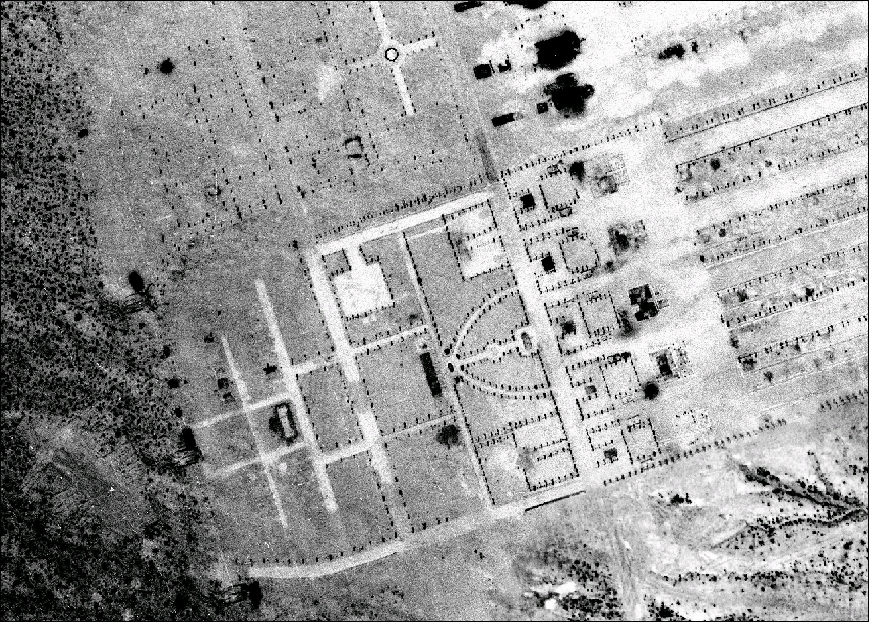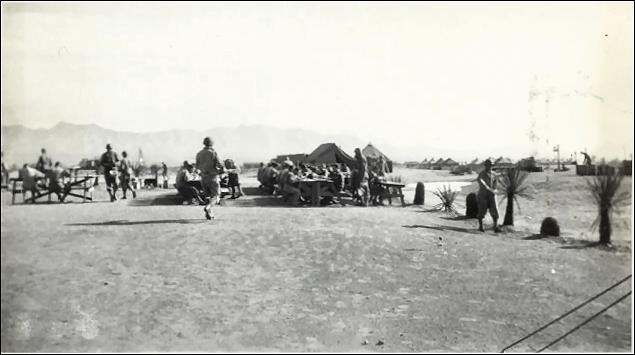 Constructed in winter 1942-1943, Camp Ibis was first occupied by the 4th Armored Division. After the departure of the 4th in June 1943, the camp was occupied by the 9th Armored Division from July to November 1943. The 9th Armored Division was replaced by the 11th Division in winter 1943, which was the last division to occupy the camp (Meller 1946 :41-42). Most of the divisions placed signs indicating their presence at the camps. The 11th Division was no exception, placing a sign over the main road into Camp Ibis. Temporary facilities at Camp Ibis consisted of 28 shower buildings for enlisted men and 14 for officers; 173 latrine buildings; 97 single, 127 double, and 100 triple wooden tent frames; a 50,000-gallon, concrete water reservoir; and a 50,000-gallon, wooden, elevated storage tank. In addition, the camp contained 23 ranges, including ones for moving targets, pistols, rifles, and .50-caliber machine guns. There were also several combat ranges, vehicle combat ranges, and transition courses. A POW camp, perhaps associated with Camp Ibis, was reported to have existed near Searchlight Junction, 1 mile south of Camp Ibis (Bard 1972 :139). Supporting this report are indications that the largest area cleared of ordnance lies immediately west of the Dead Mountains, which are located near Camp Ibis (BLM n.d.). [1: pp: 73]