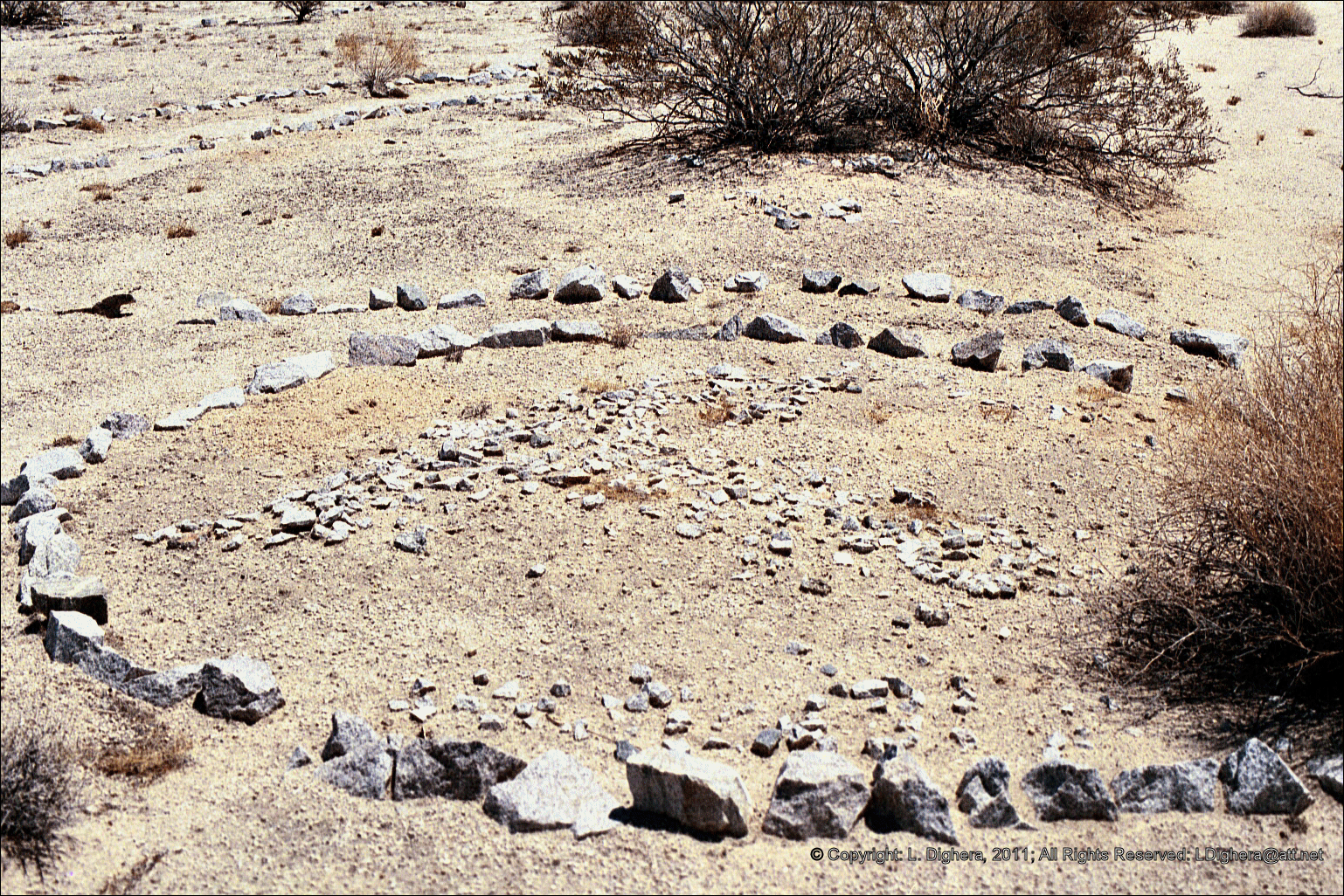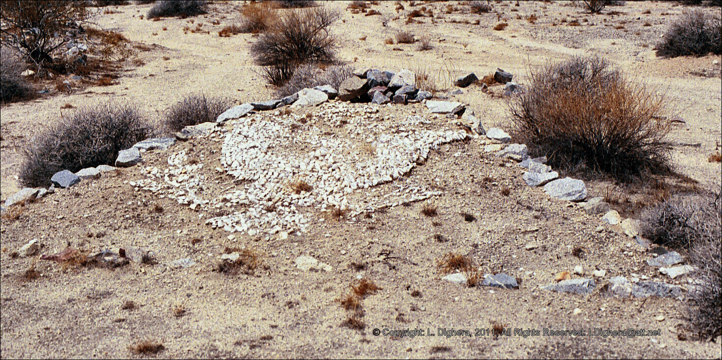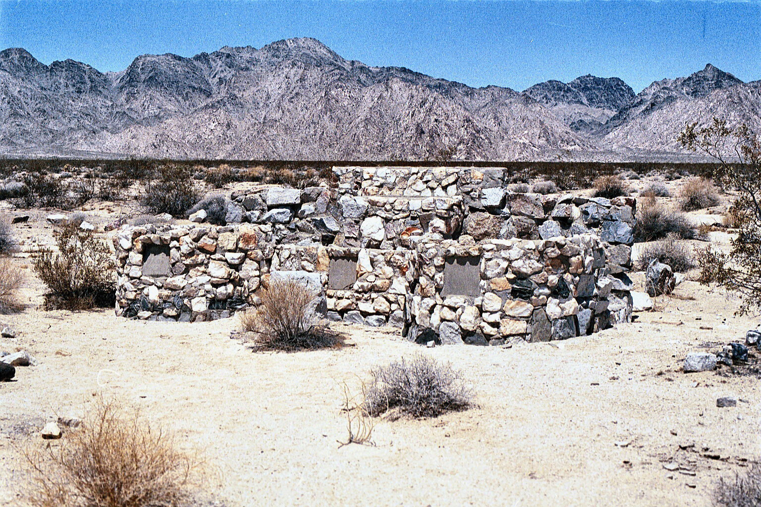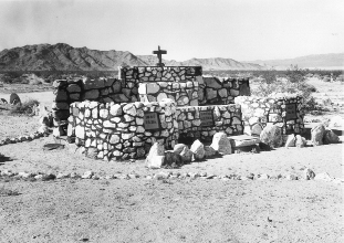 Perhaps the best-preserved divisional camp, Camp Iron Mountain has also received the most public attention. The two outdoor chapels remain; one of these (the smaller of the two) was reportedly a Protestant chapel, the other a Catholic chapel. Smoke trees stood on either side of the Catholic altar, and rocks formed a kind of sanctuary in front, with a pathway leading to the altar. The pathway was reportedly lined with cacti. The Protestant chapel, at least according to an old photograph, was used by some soldiers of the 183rd Field Artillery Group. Rock inlays in the concrete could apparently be seen in 1973, forming the numbers of the 183rd and the 951st Field Artillery Battalions (MWD 1973). The Protestant chapel also had a small sanctuary in front, with rock-lined walkways. A small cross formed by the placement of rocks in the ground could also be seen in 1973 (RP-E, 28 January 1973: C-1-C-8).