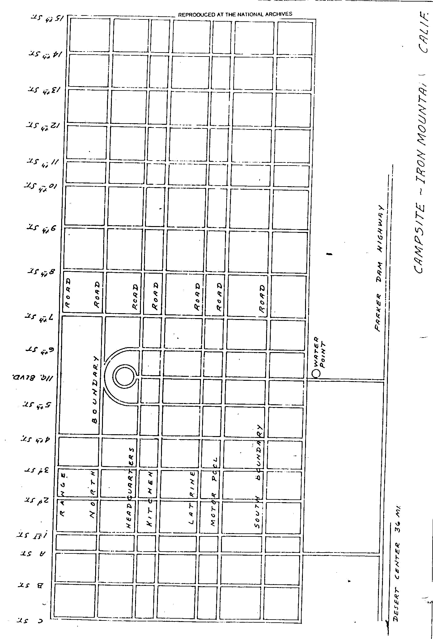 Camp Iron Mountain was laid out in the same fashion as the other divisional camps. Many nonnative plants were placed to accentuate particular features at the site. Plants, particularly smoke trees, barrel cacti, and ocotillos, were planted throughout the camp. Rocks were used to line walkways, company areas, tents, supply areas, latrines, mess halls, chapels, and many plants. Reports of a grenade-throwing range near the camp have been made. Grenade-container end caps were found behind foxholes, which were located halfway between the camp and the mountains to the west. The camp dump was also reported in the same account, farther away from camp toward the mountains (Blake 1988: 33). Individuals have reported finding crates containing antitank mines buried near the camp (RPE, 28 January 1973: C-1-C-8).
