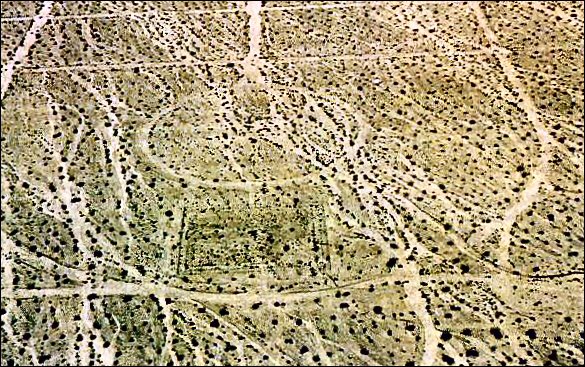 Also present at Camp Iron Mountain was a large relief map measuring 200 by 175 feet, built by the U.S. Army Corps of Engineers. The map represented the entire DTC/C-AMA area, from roughly Kingman to Twentynine Palms, and from Hoover Dam to the Coachella Valley. Built completely to scale, the map included a wooden walkway spanning its entire distance. The walkway was still extant as late as 1977, although it is gone today (Weight 1977). The map included small wooden signs indicating large topographic features, as well as divisional camps. Highways, railroads, and the MWD aqueduct were also represented (RP-E, 28 January 1973: C-1-C-8). The BLM has fenced off this feature to prevent further vandalism and has dug a diversion channel uphill to prevent erosion.