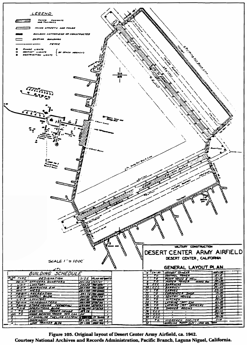 The Desert Center Army Airfield was first known as the Desert Center Airdrome and was operational beginning sometime in the winter of 1942-1943. The airfield was a subbase of Thermal Army Airfield (now KTRM, Jacqueline Cochran Regional Airport) and served as a support base for the Air Technical Services Command. A detachment of the 475th Base Headquarters and Air Base Squadron was assigned to the base in January 1943. In August 1943, the Third Airdrome Detachment was created and assigned to the airfield, which had been designated the Desert Center Army Airfield sometime prior. The detachment was made up of personnel from the deactivated 475th Base Headquarters and Air Base Squadron, and consisted of 4 officers and 53 enlisted men. Commanded by Maj. William B. Horton, the Third Airdrome Detachment was placed in charge of the operation of the airfield (U.S. Army Air Corps 1944:1; U.S. Air Force Historical Division n.d.b.: 2).