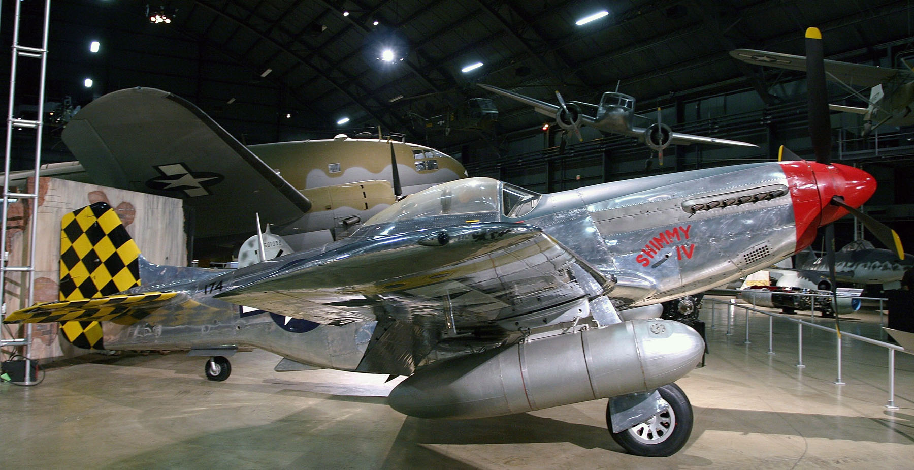 F-51s flew in the Reserve and Air National Guard until they were finally phased out in 1957. Obtained from the West Virginia Air National Guard in 1957, the aircraft on display was the last Mustang assigned to a USAF tactical unit. It is painted as the P-51D flown by Col. C.L. Sluder, commander of the 325th Fighter Group in Italy in 1944. The name of this aircraft, Shimmy IV, is derived from the names of his daughter, Sharon, and his wife, Zimmy.